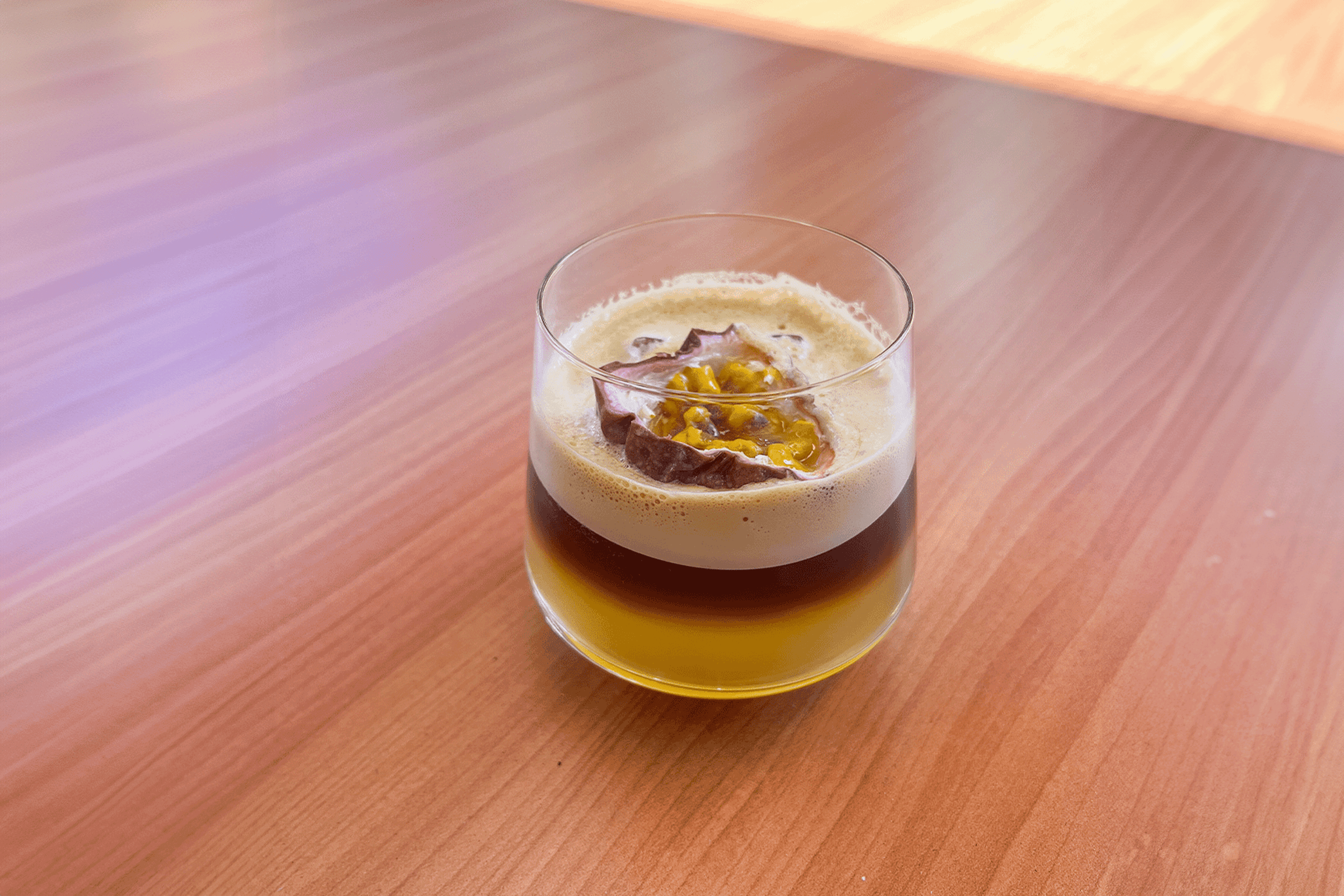 The star in our drink is Tiga Raja from Sumatra, Indonesia. Grown through a unique 3-way partnership that supports local growers with education and resources, this wet-hulled processed coffee embodies the very spirit of connection. Its flavour notes of brown spices, dark chocolate, and herbaceous notes make it a very complex and character driven coffee. This espresso is not something you would naturally pair with bright, tangy, and sweet passionfruit.