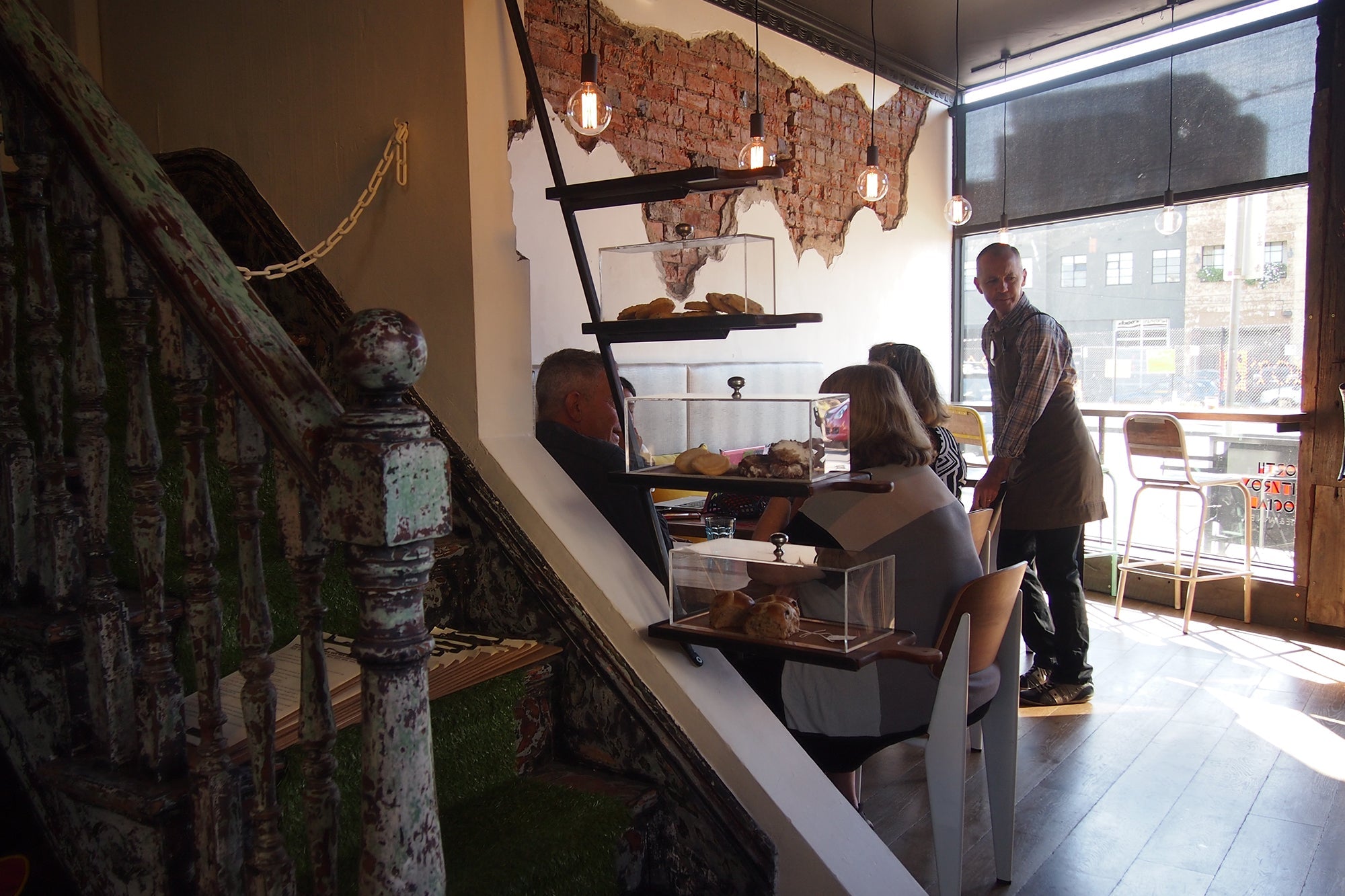 Renovating a prime, but neglected, corner site in the heart of North Fitzroy, these guys took on a project that required a lot of vision. A run down and obscure record shop has been reborn as what David describes as “a recycled, industrial lounge room.” Although some brick work remains exposed in patches, few of the original bones remain. However, a new aesthetic has been created with timber panelling (charging sockets included), geometric wallpaper and white tiling. The somewhat awkward placement of a staircase in the centre of the café has been made a feature with an AstroTurf lining and a creative multi-level cake display. The final result is very much what they had in mind at the outset. However, when asked about the biggest hurdles he faced while opening the café, David shared a familiar frustration at the amount of red tape involved. Whilst it would appear a fairly simple exercise to fit out and open a new café, unforeseen delays can certainly have a prospective new business owner tearing their hair out. With this out of the way and customers flooding in, it is now at least a fading memory!