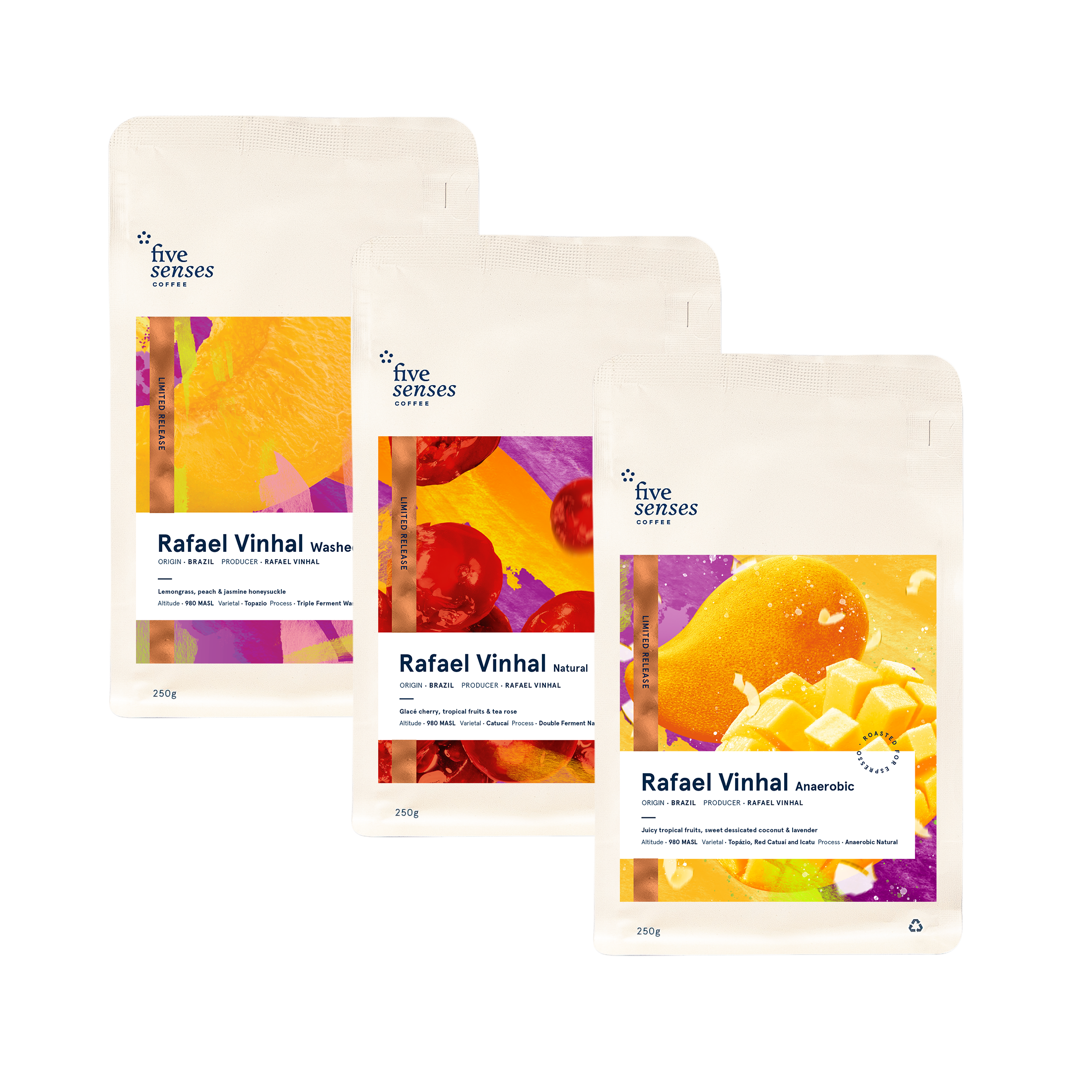 Reimagining the classic Brazilian flavour profile, Rafael Vinhal returns with an MVP performance in this limited-edition collection. Rafael Vinhal's award-winning coffees exemplify his passion for creating a unique taste experience in every cup. To celebrate the incredible and innovative processes that have captivated us all over the past 3 years, we're launching the first-ever Rafael Vinhal collection showcasing all three of this year's Vinhal Limited Release coffees.