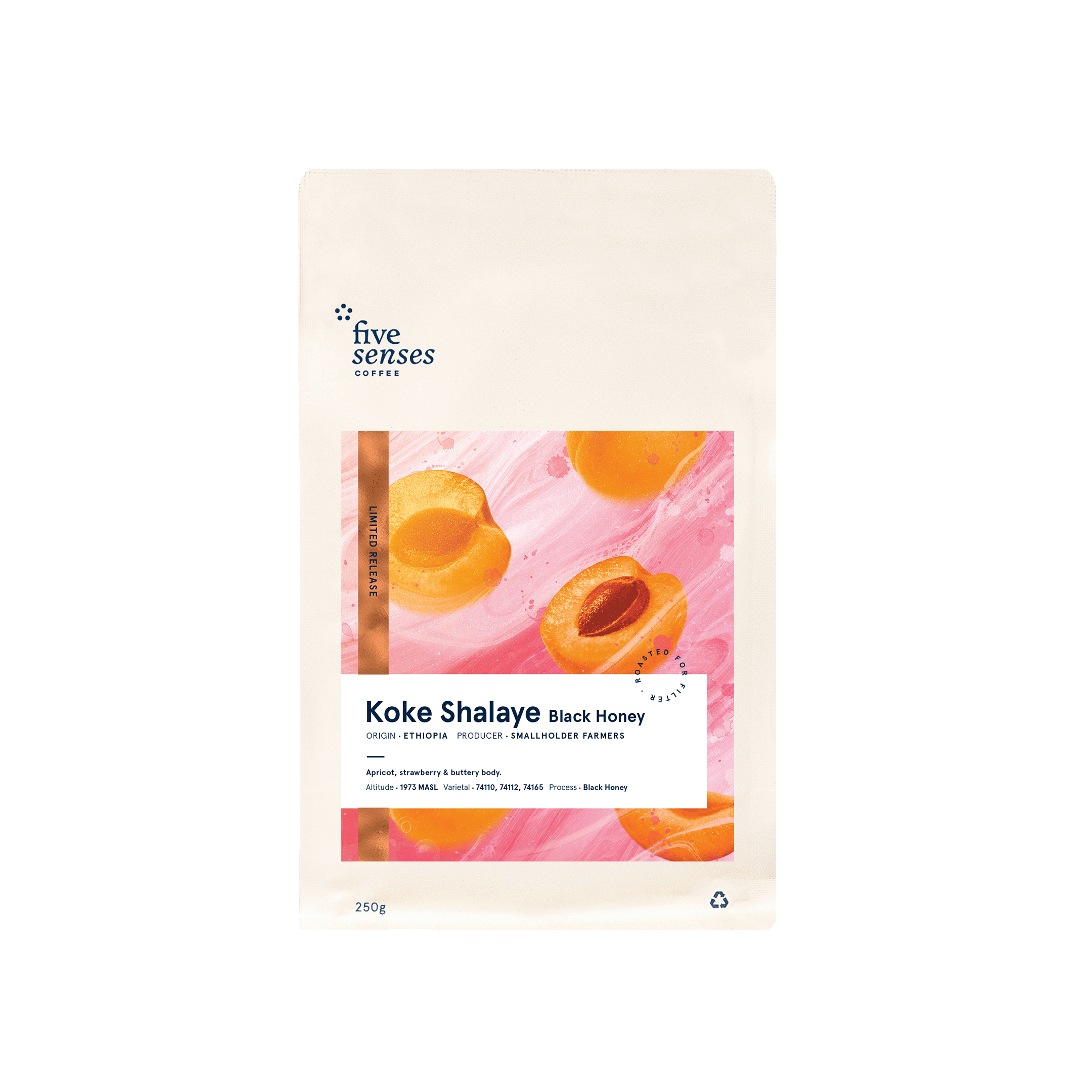 From the lush highlands of Ethiopia’s Gedeo Zone comes Koke Shalaye, a black honey-processed gem grown at 1973 masl by over 2,000 smallholder farmers in the village of Koke. Nourished by the Futay River and cultivated organically from heirloom landraces, this coffee is as expressive as the land it comes from. At the Koke Shalaye Washing Station — established in 2019 by Abreham Mengiste — cherries are selectively hand-picked, fermented for 48–72 hours, and dried with 80% of the mucilage intact. This meticulous black honey process draws out a remarkable intensity and depth. The result is a coffee that’s complex and intense up front, with ripe apricot notes, a buttery body, and plenty of structure. As it cools, creamy strawberry sweetness emerges, layering beautifully into the cup's evolving character. Sourced through our partners at Primrose Coffee, a veteran Ethiopian exporter and member of the International Women’s Coffee Alliance, this lot celebrates innovation, traceability, and local impact.