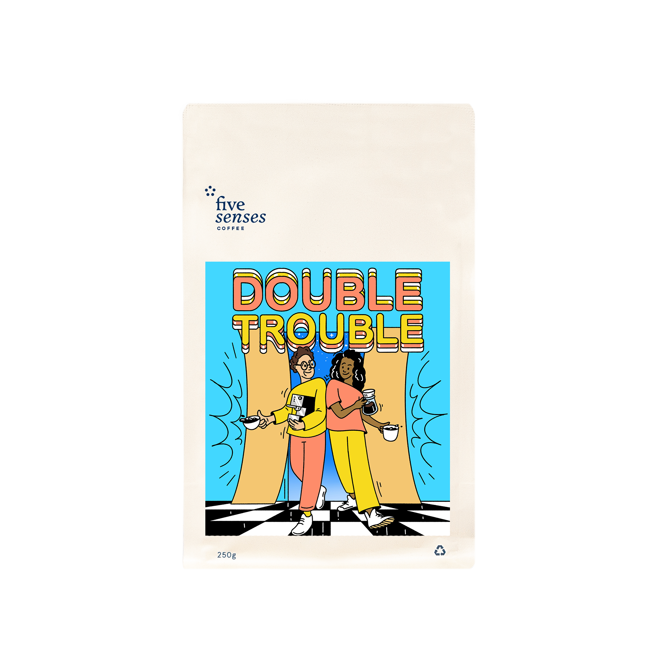 Bold, bright and full of good energy, Double Trouble captures that spark when two coffee lovers set off side by side, each chasing their perfect cup. It's a playful nod to the idea that no matter how you brew, coffee's always better shared. This limited seasonal release celebrates connection through contrast. For the first time ever, it's roasted for both espresso and filter. Whether you're pulling a shot or pouring a brew, you'll discover the same story told two delicious ways. Sourced from Ethiopia's celebrated Guji Zone and the lush forests of Kaffa, Double Trouble bursts with bright stone fruit and citrus. The espresso roast shines with lively apricot and lime, softening into strawberries-and-cream sweetness with milk. As a filter, expect juicy apricot and peach tones, lifted by a zesty lime sparkle and rounded with a silky, elegant finish. Different paths, same joy. This is coffee that brings people together.
