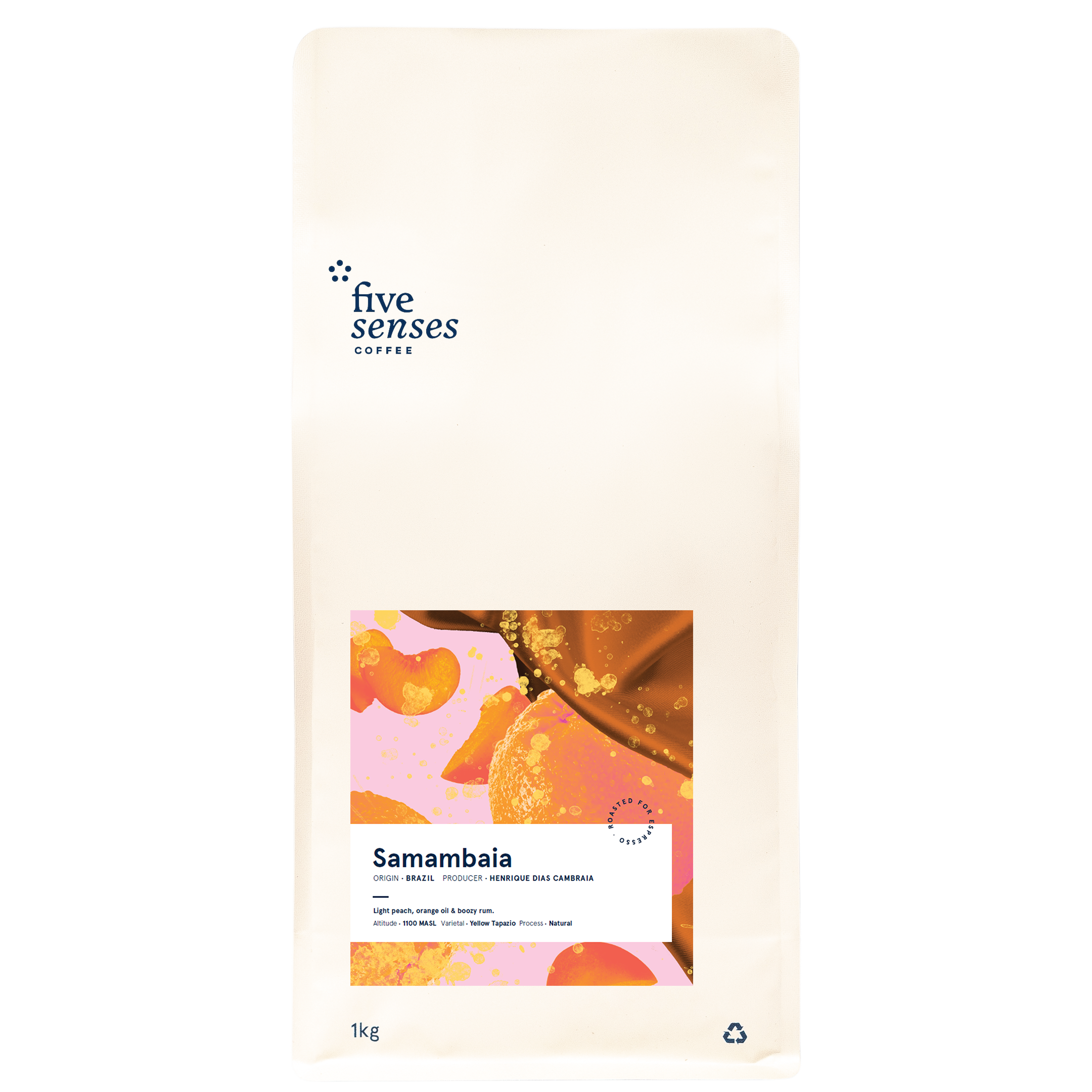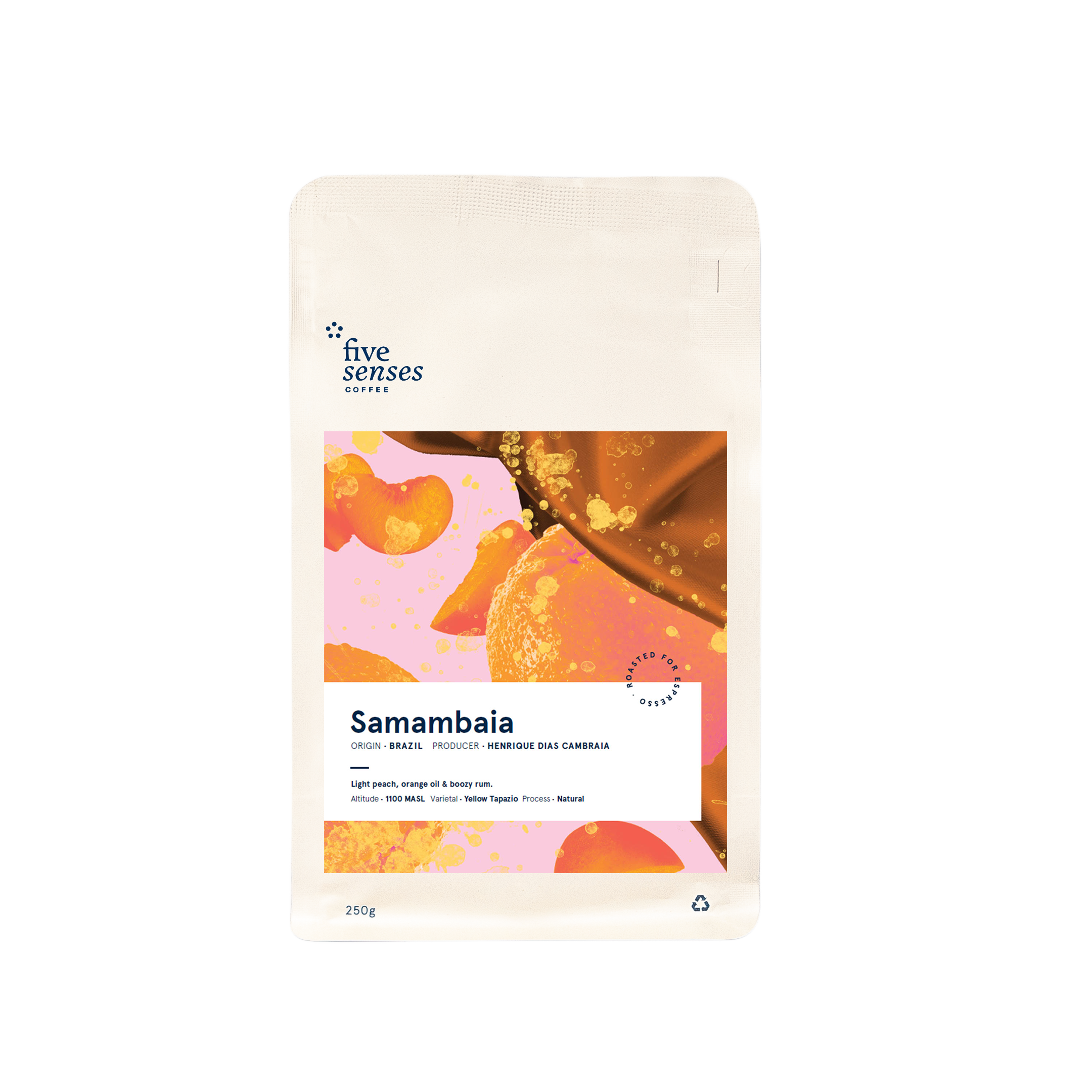 From one of our longest-standing relationships comes this beautifully satisfying Brazilian coffee from the Cambraia family. Managing the family estate, established in the 19th century, Henrique Dias Cambraia is passionate about his specialty coffee. Five Senses has a long history with Fazenda Samambaia in the gentle hills of Sul de Minas, Brazil. The estate is overseen by Henrique Cambraia who is focused on quality along with socially responsible and environmentally sustainable farming. The Yellow Topázio is a cross between Mundo Nuvo and Red Catuaí, is not commonly seen in Australia and has been naturally processed on patios at 1200 MASL. A great example of the consistently satisfying flavours that make Brazilian coffees such a cornerstone of great espresso around the world.