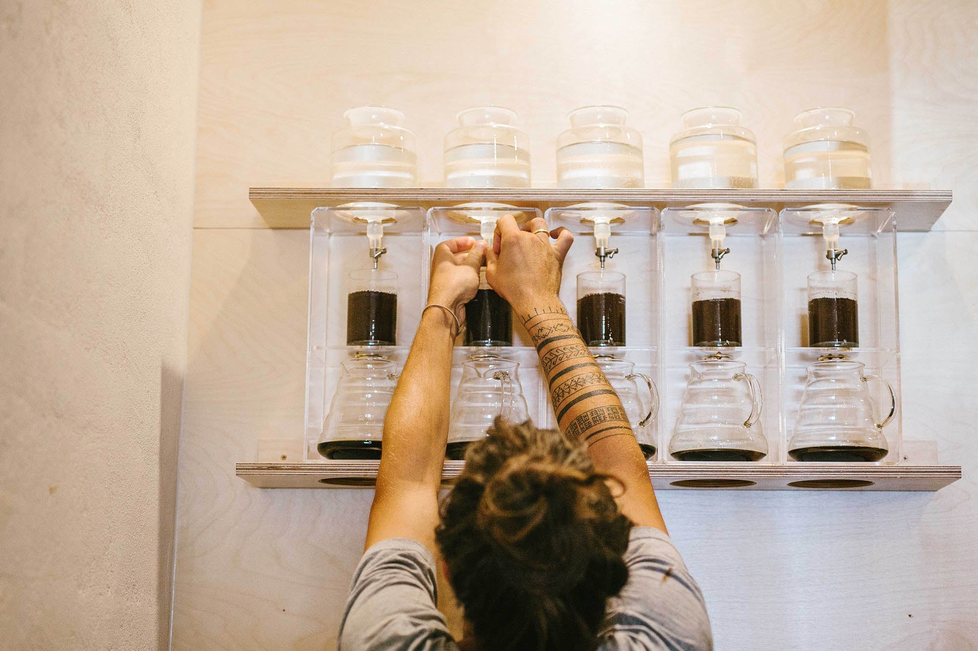 The full immersion method offers by far the largest volume – it is the batch brew of the cool coffee world. Most commonly brewed in a special bucket (see: Toddy Cold Brew System), the variables of this brewing method are easier to control. Touchwood in Richmond, Melbourne nail this brew method, successfully bringing out the individual characteristics of origin of their coffee beans.